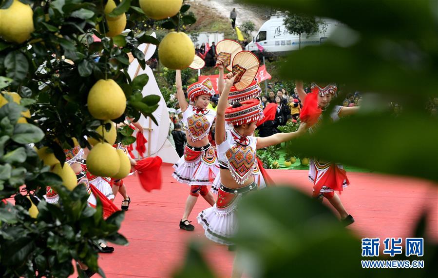 11月18日,演员在宣恩县贡水白柚文化节上进行文艺表演。 当日,湖北省恩施土家族苗族自治州宣恩县举行贡水白柚文化节,柚农们载歌载舞,与客商、游客共庆丰收。 新华社发(宋文 摄)