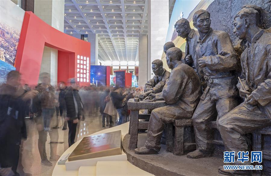11月18日,观众在观看安徽小岗村农民按下包产到户“红手印”的雕塑(慢门拍摄)。“伟大的变革——庆祝改革开放40周年大型展览”11月13日在国家博物馆隆重开幕。自开幕以来,展览吸引了众多参观者。截至11月18日,累计参观人数超过19万人。新华社记者 才扬 摄