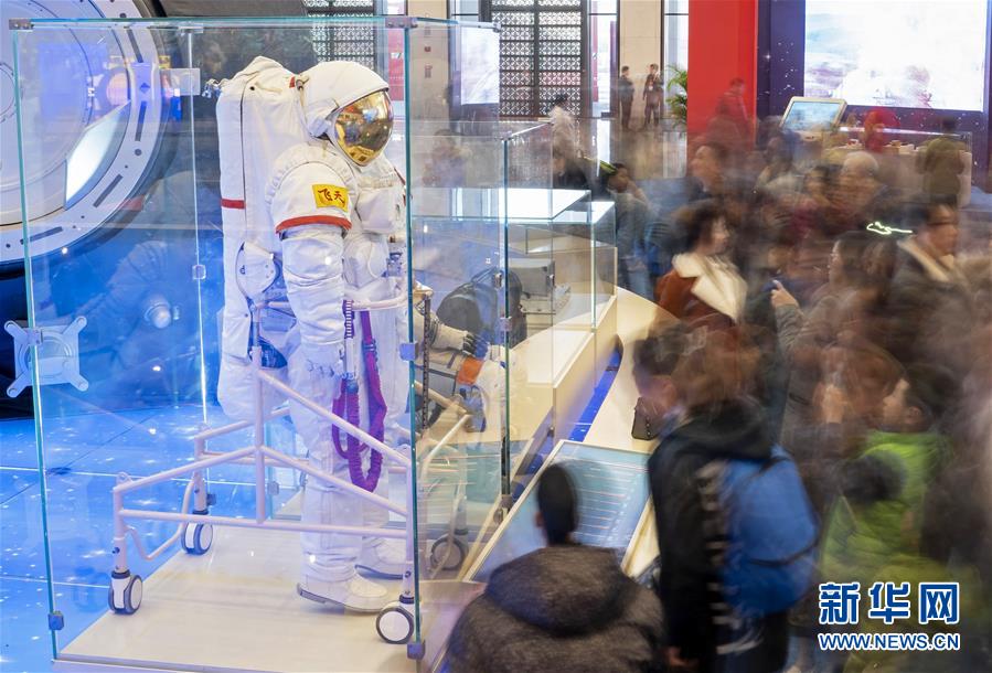 11月18日,观众在观看航天服(慢门拍摄)。“伟大的变革——庆祝改革开放40周年大型展览”11月13日在国家博物馆隆重开幕。自开幕以来,展览吸引了众多参观者。截至11月18日,累计参观人数超过19万人。新华社记者 才扬 摄