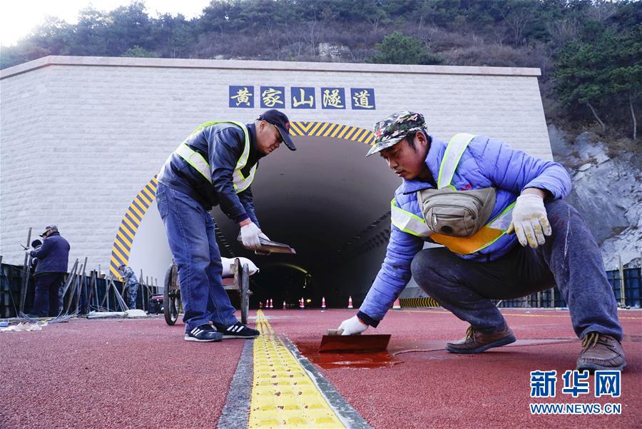 11月18日,工人在京秦高速遵化段一隧道口铺设防滑路面。