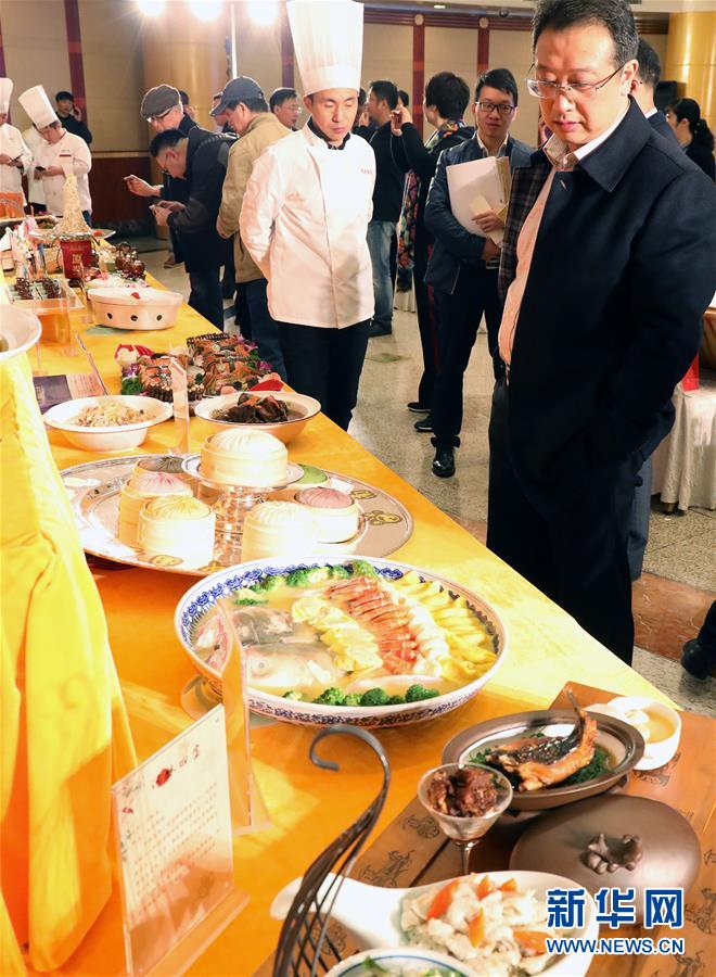 11月18日,参观者在发布会现场观看展出的泰州美食。当日,江苏省泰州市的“泰有味”泰州美食发布会在上海举行。新华社记者 陈飞 摄
