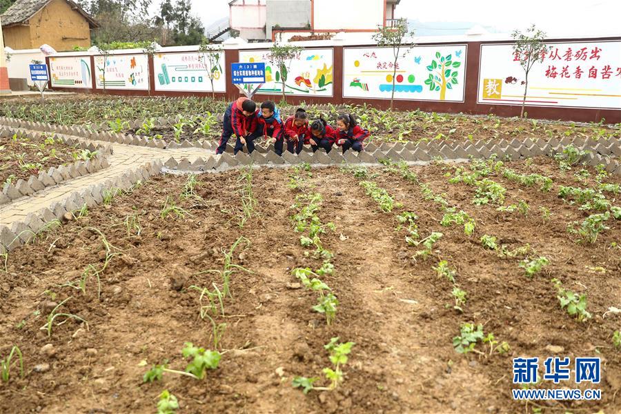 贵州省织金县金龙小学的学生在学校的蔬菜园中查看,这里使用的有机肥料是经过净化的厕所排放物(10月23日摄)。新华社记者 张玉薇 摄