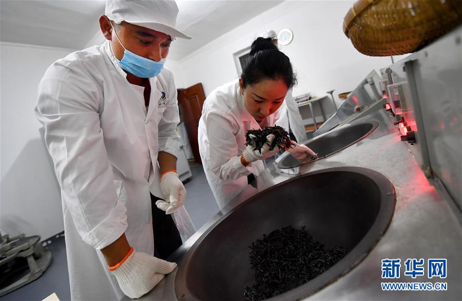 五指山市通什镇什会村贫困户王卫东(左)在五指山妙自然茶园学习炒茶技术(11月15日摄)。他2015年进入茶园工作,2017年脱贫。新华社记者 郭程 摄