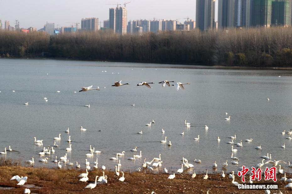 11月18日,在三门峡天鹅湖国家城市湿地公园,成群的白天鹅在园内,吸引大批游客前来观赏。据三门峡市发布的消息,截至11月18日,飞抵该湿地公园栖息过冬的白天鹅数量已达5300余只。中新社记者 王中举 摄