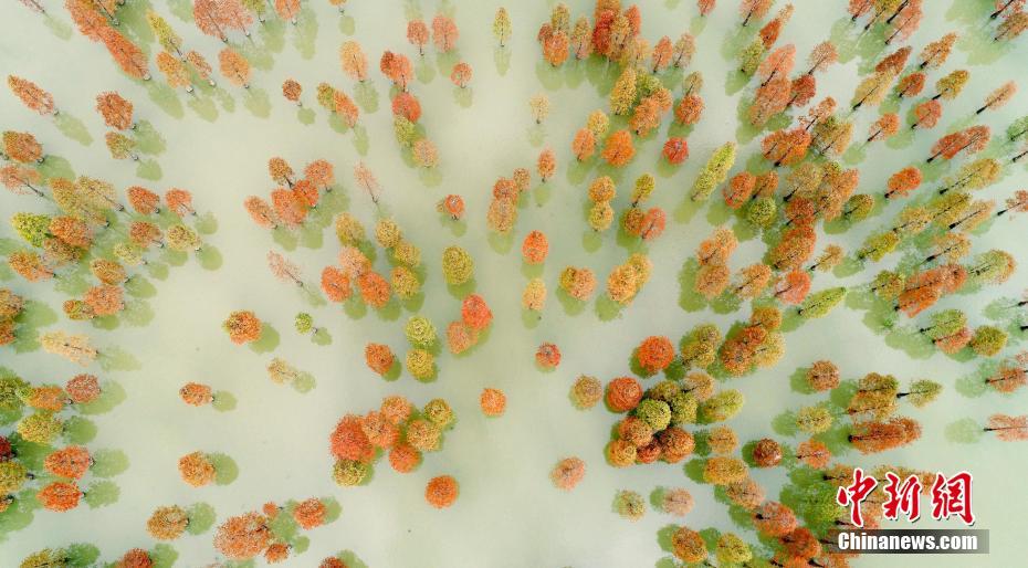 11月19日,安徽庐江县柯坦镇大汉塘水库数千株池杉树叶变红,景色如画。中新社发 王闽 摄 图片来源:CNSPHOTO
