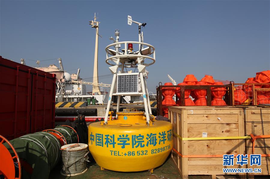 11月19日拍摄的“科学”号科考船上搭载的深海大浮标(中)。 新华社发