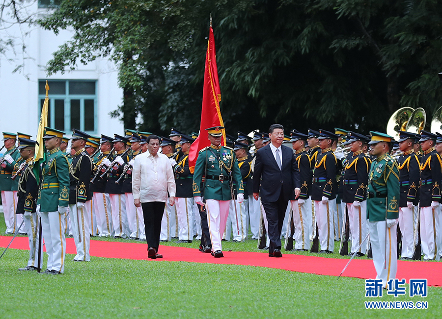 11月20日,国家主席习近平在马尼拉同菲律宾总统杜特尔特举行会谈。会谈开始前,习近平出席杜特尔特在总统府前草坪举行的隆重欢迎仪式。这是习近平在杜特尔特陪同下沿红地毯检阅仪仗队。 新华社记者 鞠鹏摄