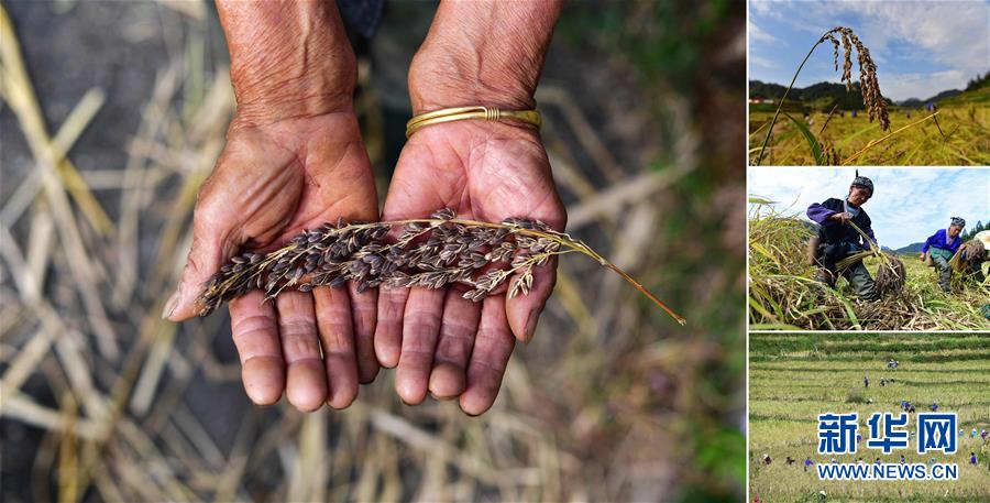 拼版照片:左图为在安太乡元宝村,80岁的贾荣专手捧刚刚收获的香糯;右上图为成熟待收的香糯;右中图为贾荣专(左)在收割香糯;右下图为村民们在收香糯(照片均摄于10月30日)。2017年,贾荣专加入村里的香糯种植合作社。香糯是广西融水大苗山的特产,它生长在高寒高海拔的特殊自然环境中,产量少,营养价值高。 广西融水苗族自治县是国家扶贫工作重点县,全县“九山半水半分田”,生活生产环境较为恶劣,脱贫攻坚任务艰巨,目前还有7.68万贫困人口。面对经济发展落后、贫困面广且程度深的现状,当地把脱贫攻坚与创新产业扶持相结合,依托生态资源优势,实施“特色产业富民行动”,通过发展特色民族旅游、林下经济和特色养殖业等扶贫产业,带动贫困群众依靠勤劳的双手,拔穷根摘穷帽,实现脱贫致富。据了解,目前全县贫困户参与特色产业发展的有2.9万户,扶贫产业覆盖率达95%。 新华社记者 黄孝邦 摄
