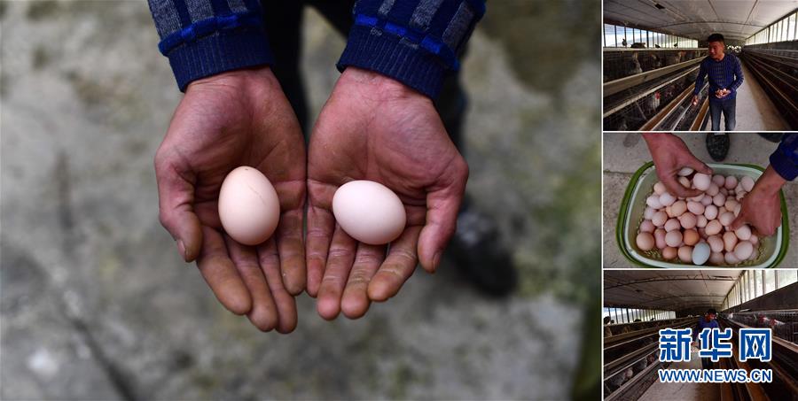 拼版照片:左图为贫困户李先强手捧养殖合作社生产的鸡蛋(11月19日摄);右图为李先强在鸡舍里捡鸡蛋(照片均摄于11月19日)。李先强是融水苗族自治县香粉乡香粉村的贫困户,从2016年开始,他和15个贫困户一起发展土鸡养殖。目前合作社养有3000多只鸡,年产鸡蛋1万多斤。 广西融水苗族自治县是国家扶贫工作重点县,全县“九山半水半分田”,生活生产环境较为恶劣,脱贫攻坚任务艰巨,目前还有7.68万贫困人口。面对经济发展落后、贫困面广且程度深的现状,当地把脱贫攻坚与创新产业扶持相结合,依托生态资源优势,实施“特色产业富民行动”,通过发展特色民族旅游、林下经济和特色养殖业等扶贫产业,带动贫困群众依靠勤劳的双手,拔穷根摘穷帽,实现脱贫致富。据了解,目前全县贫困户参与特色产业发展的有2.9万户,扶贫产业覆盖率达95%。 新华社记者 黄孝邦 摄