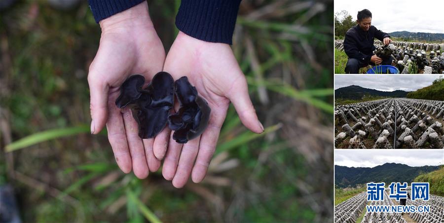 拼版照片:左图为在大浪镇上里村,致富带头人唐志海手捧刚刚收获的木耳;右上图为唐志海在木耳种植基地里采摘木耳;右中图为木耳种植基地;右下图为唐志海在木耳种植基地里查看木耳长势(照片均摄于11月18日)。近年来,上里村依靠发展红薯、木耳种植,已于2016年实现脱贫。 广西融水苗族自治县是国家扶贫工作重点县,全县“九山半水半分田”,生活生产环境较为恶劣,脱贫攻坚任务艰巨,目前还有7.68万贫困人口。面对经济发展落后、贫困面广且程度深的现状,当地把脱贫攻坚与创新产业扶持相结合,依托生态资源优势,实施“特色产业富民行动”,通过发展特色民族旅游、林下经济和特色养殖业等扶贫产业,带动贫困群众依靠勤劳的双手,拔穷根摘穷帽,实现脱贫致富。据了解,目前全县贫困户参与特色产业发展的有2.9万户,扶贫产业覆盖率达95%。 新华社记者 黄孝邦 摄