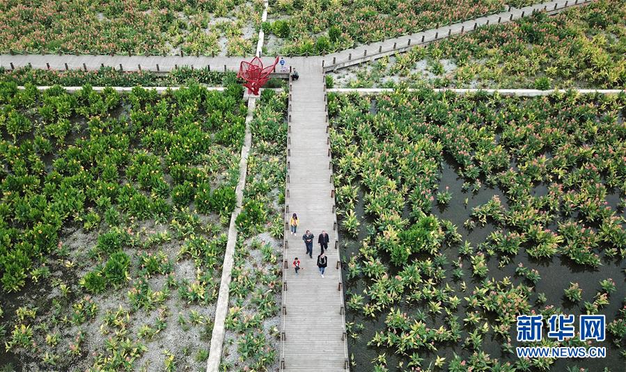 市民在广西南宁市那考河湿地公园享受休闲时光(4月7日无人机拍摄)。新华社记者 周华 摄