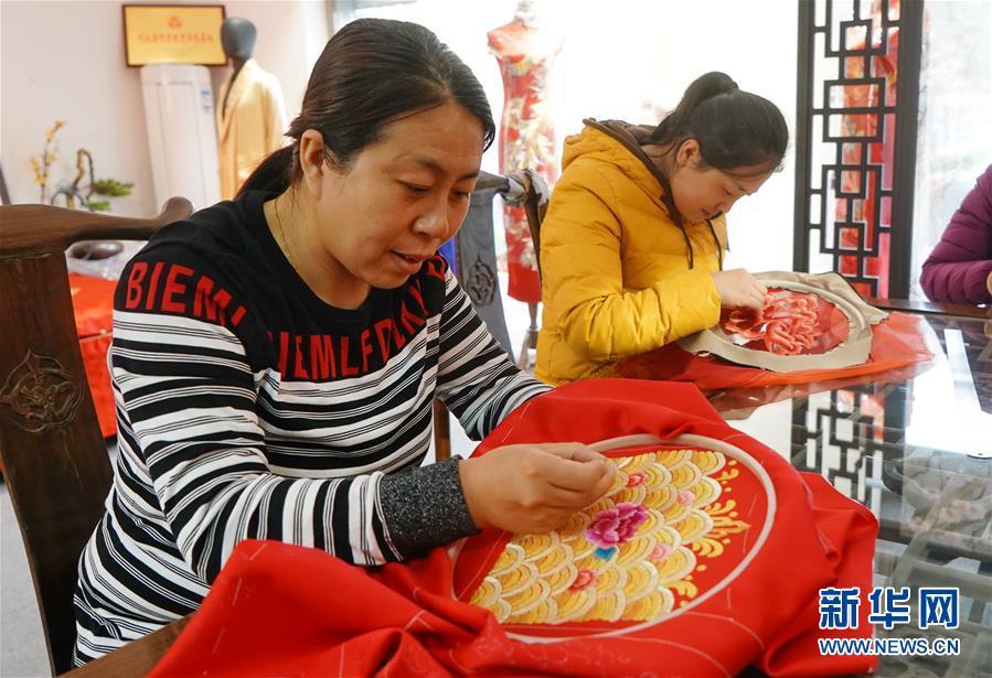 肃宁县丽秀坊的工人在绣手推绣(11月21日摄)。新华社记者杨世尧摄