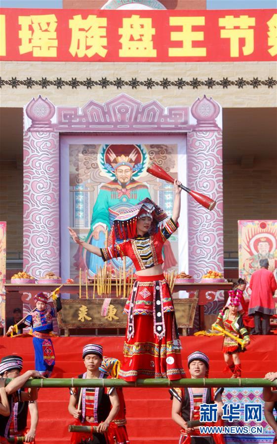 11月23日,瑶族同胞在广西富川瑶族自治县举行的盘王节活动上跳瑶族长鼓舞。 新华社发(廖祖平 摄)