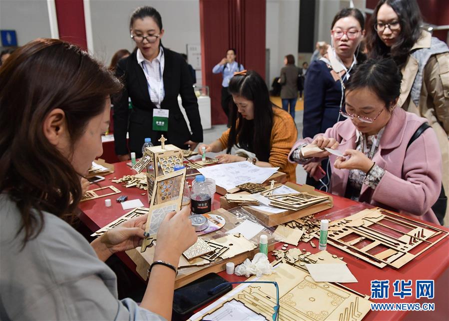 11月23日,几位参观者在工作人员的指导下自己动手体验“窗棂”台灯的制作。 新华社记者 李贺 摄