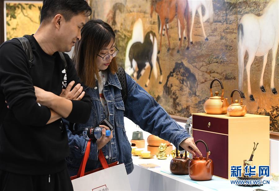 11月23日,两位参观者在“博博会”上观看文创产品。 新华社记者 李贺 摄