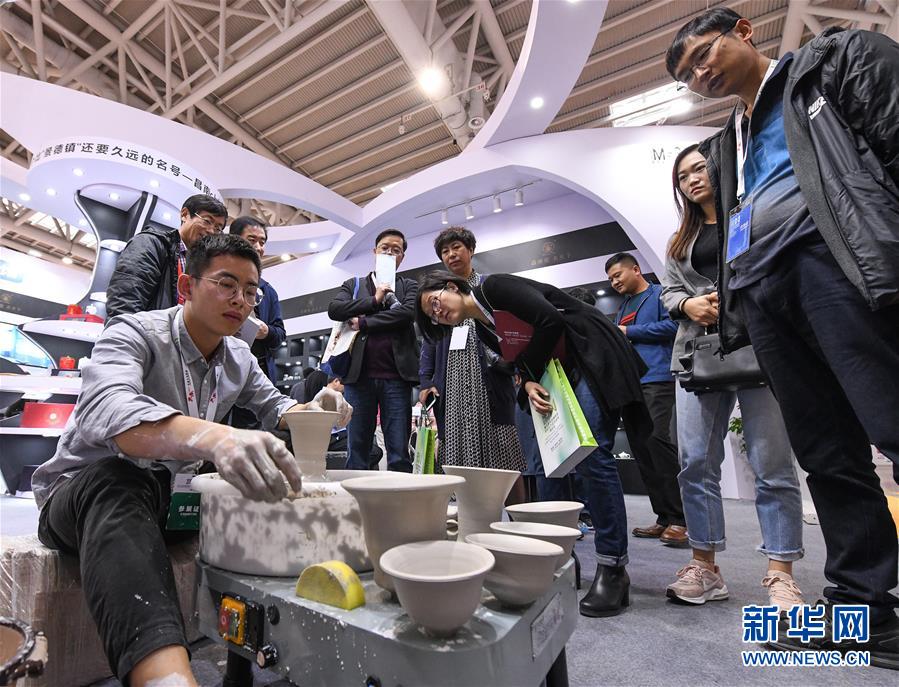 11月23日,景德镇中国陶瓷博物馆展位上的技师在向参观者展示瓷器制作中的制坯工艺。 新华社记者 李贺 摄
