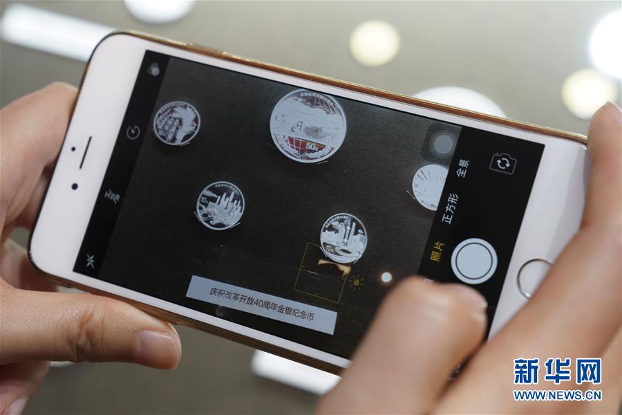 11月24日,观众在“伟大的变革——庆祝改革开放40周年大型展览”上拍摄庆祝改革开放40周年金银纪念币。 新华社记者 殷刚 摄