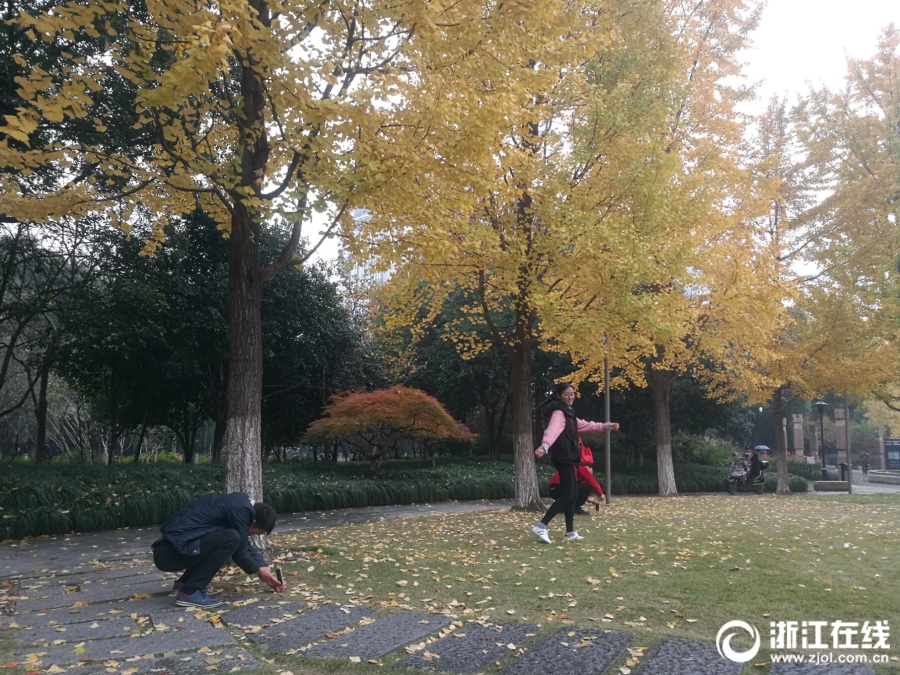 11月25日,处于杭州闹市区的武林小广场,一大片银杏树迎来了最美的风景,许多市民在家门口就能赏略金黄色的景色,乐此不彼。(浙江在线记者 邵全海 摄)