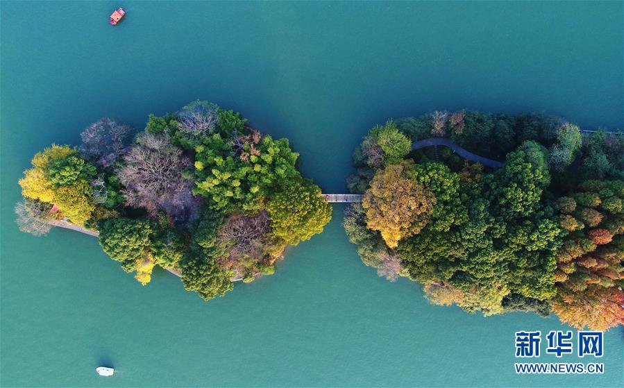 两只小船行驶在湖南烈士公园年嘉湖湖面(11月25日无人机拍摄)。 新华社记者 李尕摄