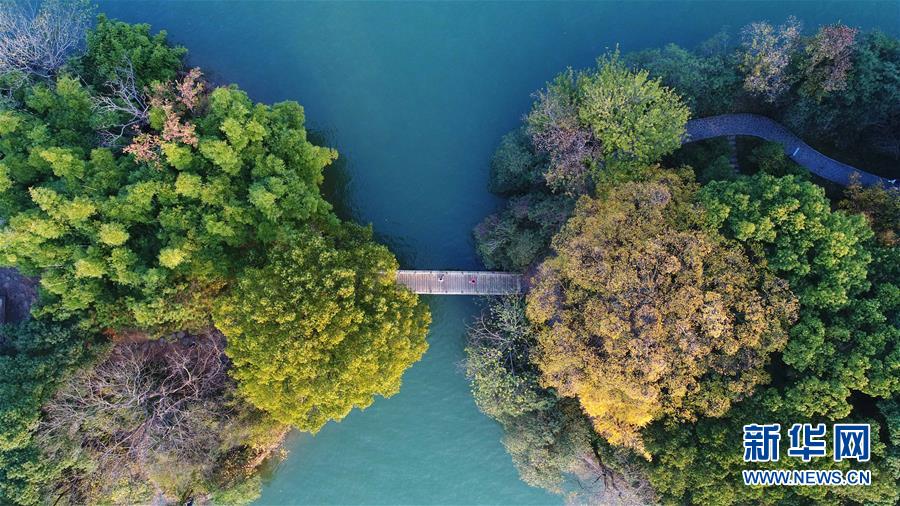 游客通过湖南烈士公园年嘉湖湖面一座小桥(11月25日无人机拍摄)。新华社记者 李尕摄