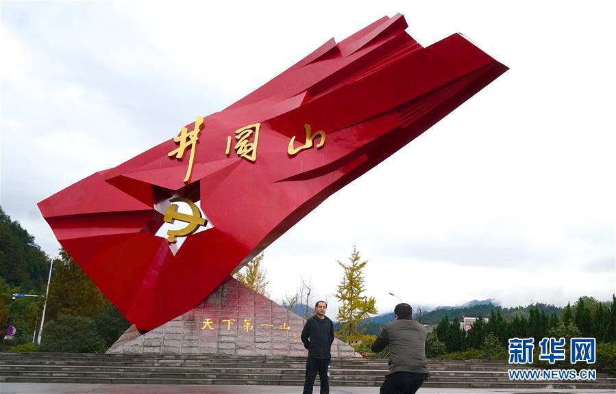 游客在井冈山的“井冈红旗”雕塑前参观留影(11月21日摄)。 新华社记者 胡晨欢 摄
