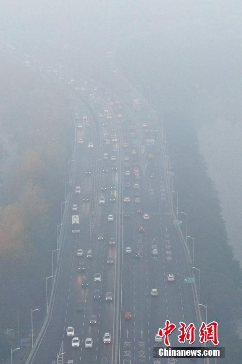 11月26日,全国多地出现大雾天气,影响市民出行。中央气象台26日晨通报,全国多地出现低能见度的大雾天气,江苏中南部、浙江北部、安徽南部等地能见度不足500米,局地能见度不足50米。图为江苏南京车辆在大雾笼罩的道路上行驶。 泱波 摄