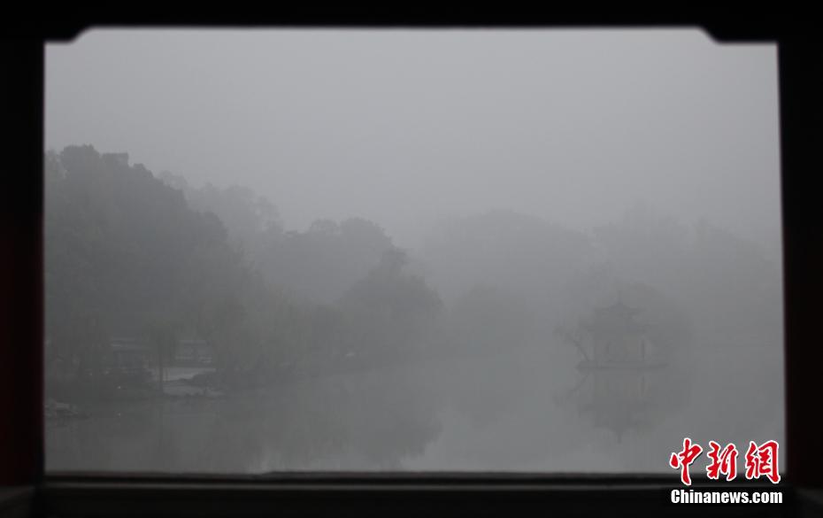 11月26日,古城扬州大雾弥漫,雾中的瘦西湖风景区云雾缭绕,吸引了一批中外摄影爱好者和游人前来采风、游览。图为一片雾茫茫的瘦西湖。孟德龙 摄