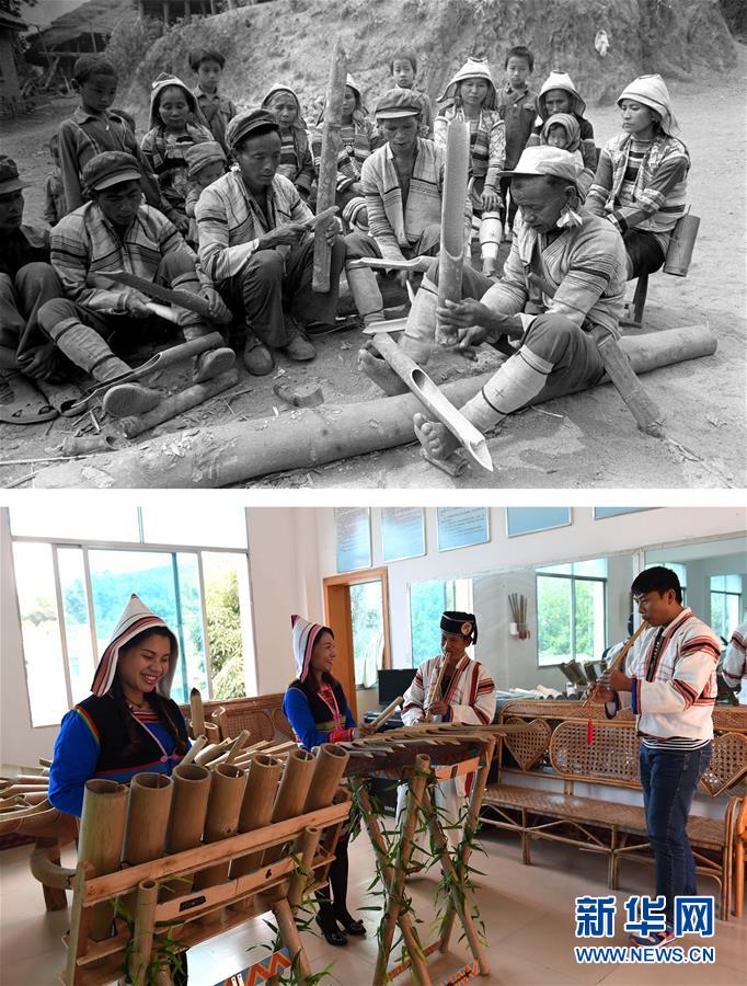 这是一张拼版照片,上图为:1988年拍摄的基诺山的基诺族群众使用竹筒乐器在村寨里演奏(资料照片);下图为:2015年11月5日拍摄的基诺山基诺族乡文化站的几名工作人员在演奏民族乐器(新华社记者蔺以光摄)。 新华社发