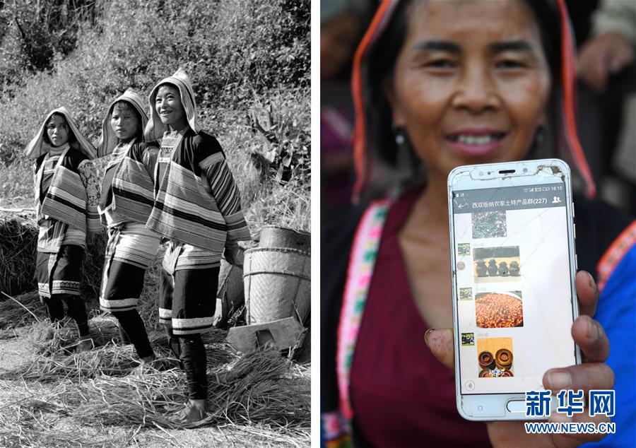 这是一张拼版照片,左图为:1984年拍摄的基诺山的几名基诺族妇女用脚踩稻穗脱粒的场景(资料照片);右图为:2018年11月20日拍摄的基诺山基诺族乡巴卡村的基诺族妇女李秀珍用手机展示她家使用微商出售土特产的微信群(新华社记者蔺以光摄)。 新华社发