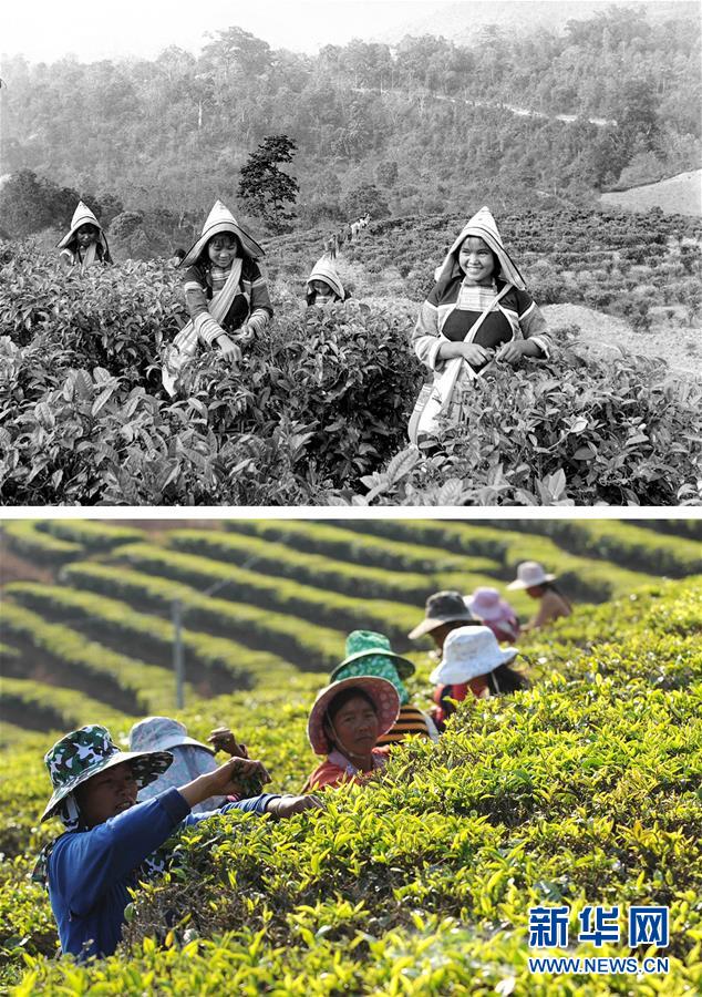 这是一张拼版照片,上图为:1979年拍摄的基诺族群众在采茶(资料照片);下图为:2011年2月22日拍摄的基诺山基诺族乡的茶农在采摘茶叶(新华社记者蔺以光摄)。 新华社发