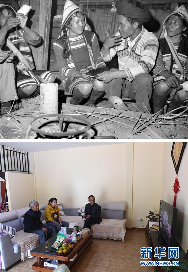 这是一张拼版照片,上图为:1981年拍摄的基诺山基诺族乡群众在屋内聊天(资料照片);下图为:2018年11月20日拍摄的基诺族老人资切(左一)和亲朋在新居里看电视(新华社记者蔺以光摄)。 新华社发