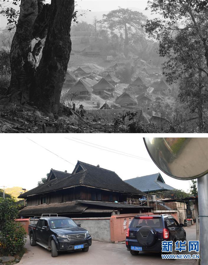 这是一张拼版照片,上图为:1983年拍摄的基诺山的民居基本都是茅草房(资料照片);下图为:2018年11月20日拍摄的基诺山基诺族乡巴飘村的新居和村民购买的汽车(新华社记者蔺以光摄)。 新华社发