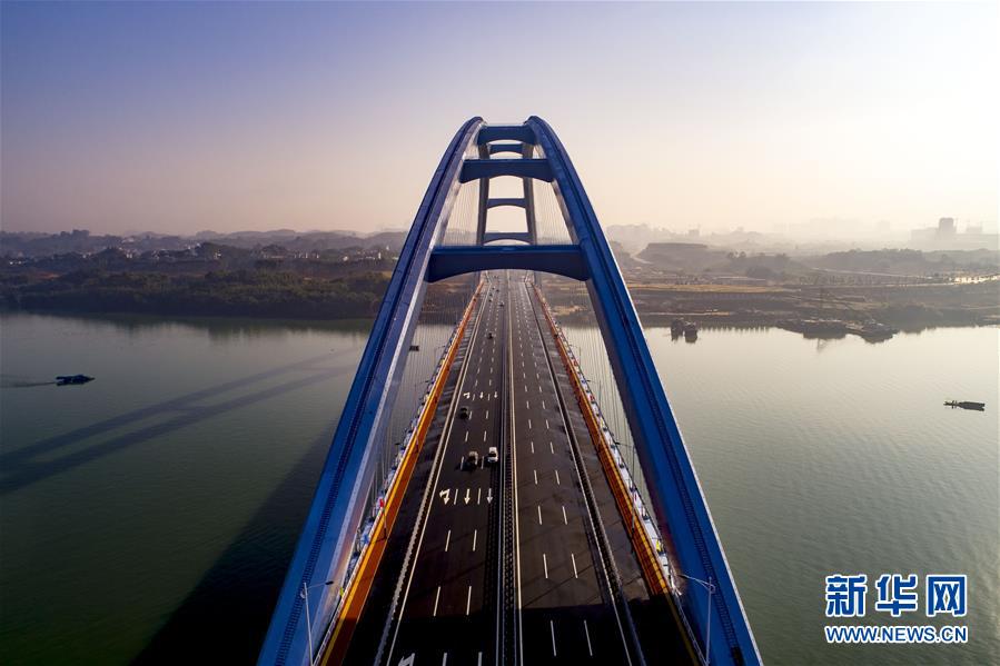 11月27日,车辆行驶在广西柳州官塘大桥(无人机拍摄)。 当日,广西柳州官塘大桥建成通车。柳州官塘大桥横跨柳江,水中不设桥墩,跨度达457米,整桥主线全长1155.5米,桥面由148根吊索与上方的两条拱座相连。 新华社发(李斌 摄)