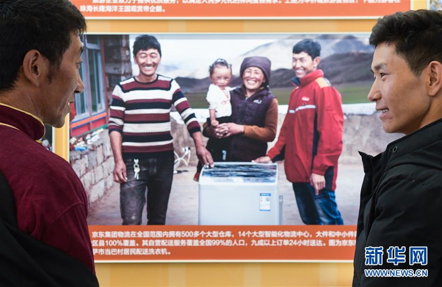 11月26日,在中国国家博物馆“伟大的变革——庆祝改革开放40周年大型展览”上,扎西平措(右)和多杰观看展板上自己的照片。 当日,来自西藏自治区的电商物流工作人员扎西平措和藏族群众多杰在北京参观“伟大的变革——庆祝改革开放40周年大型展览”。 新华社记者 李贺 摄