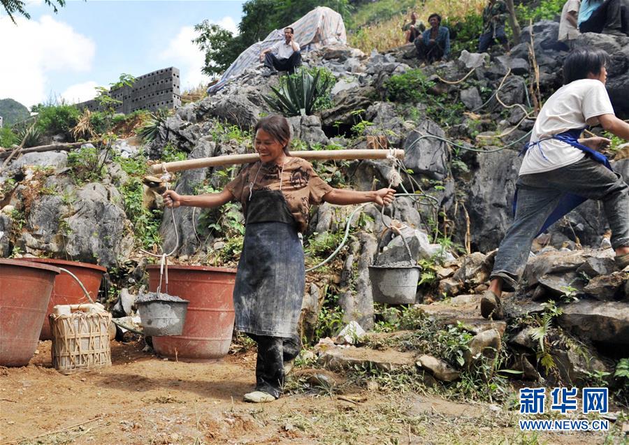 广西大化瑶族自治县瑶族群众在修建水渠(2011年8月20日摄)。 新华社记者张爱林摄