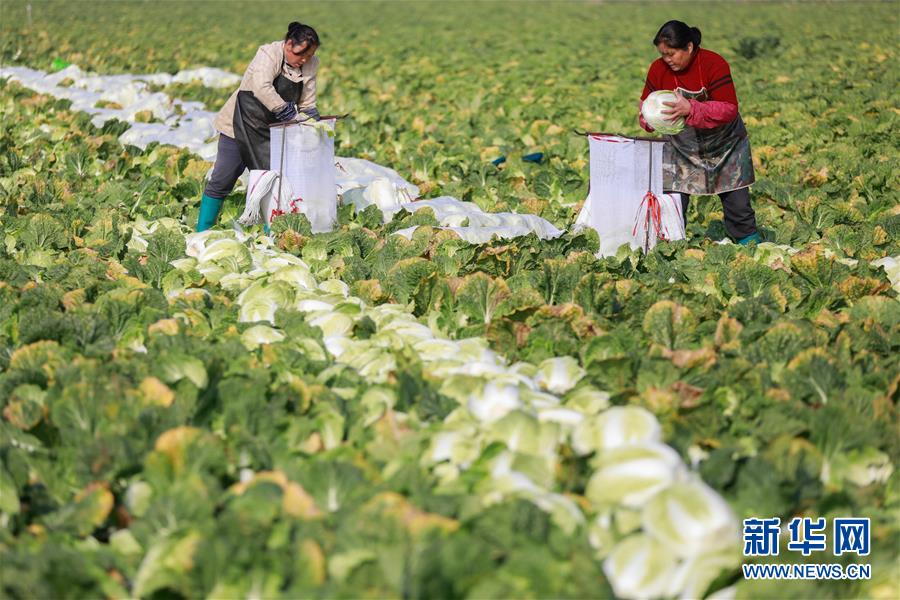 11月27日,江苏省盱眙县淮河镇蛤滩村菜农在收获大白菜。近日,江苏省淮安市盱眙县淮河镇“海外订单”冬储大白菜成熟上市,当地农民抢收、装运大白菜外运。自2016年开始,淮河镇与韩国、日本客商签订大白菜出口订单,实施“海外订单”蔬菜种植模式,带动菜农增收。新华社发(周海军 摄)