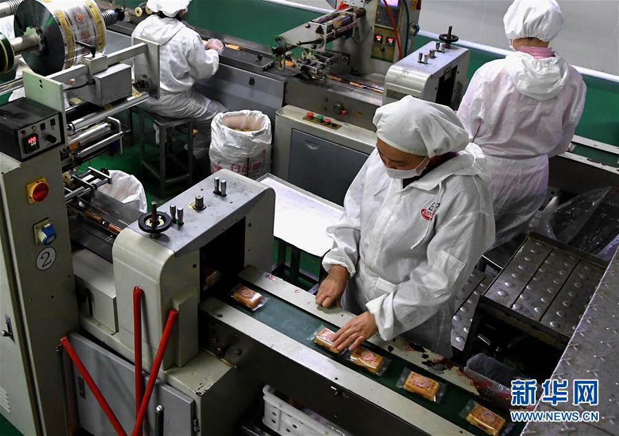 11月27日,工作人员在河南省临颍县一家休闲食品生产企业的车间内包装华夫饼。近年来,河南省临颍县依托本地农副产品资源优势,把食品产业作为县域经济的主导产业,目前,该县拥有各类食品加工企业120多家,初步形成了产品种类齐全、产业链条完整的食品产业集群。新华社记者 李安 摄