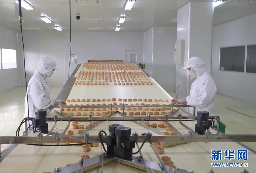 11月27日,在向阳镇四川米老头食品工业集团有限公司,两名工人在蛋糕烘焙车间流水线上作业。 新华社记者 江宏景摄