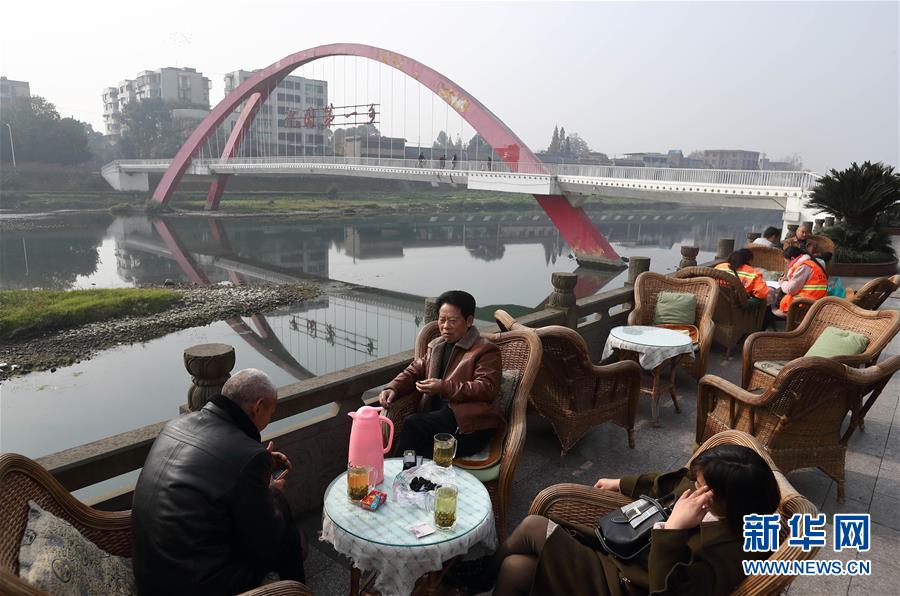 11月26日,几名当地群众在青白江向阳镇段河边喝茶享受冬日暖阳。 新华社记者 江宏景摄