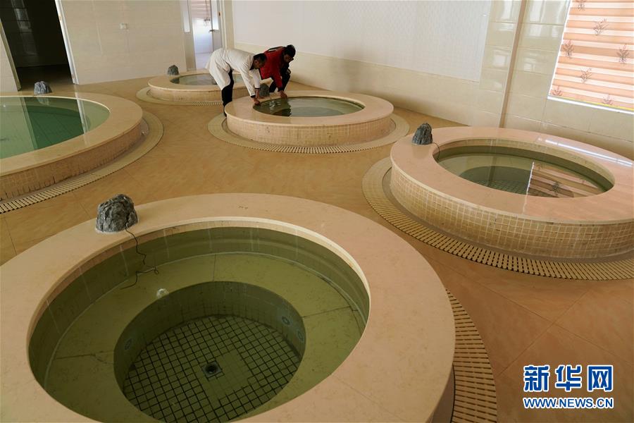西藏自治区藏医院风湿病防治研究羊八井基地工作人员在查看药浴池子(2018年11月21日摄)。新华社记者普布扎西摄