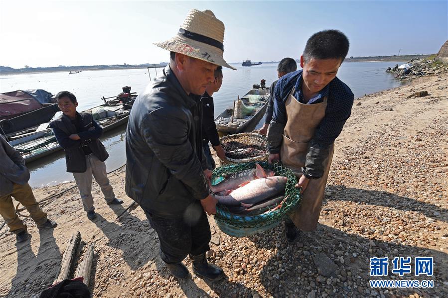 11月29日,江西省南昌县南新乡黄渡村的渔民在转运刚捕获的大鱼。 新华社记者 万象 摄