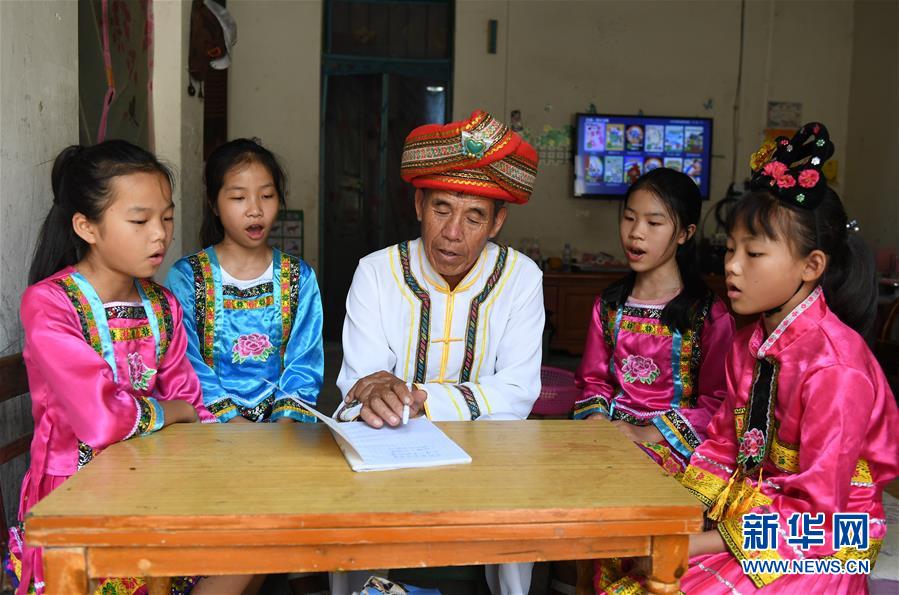 在广西河池市宜州区庆远镇东屏村,国家级非物质文化遗产刘三姐歌谣代表性传承人谢庆良(左三)在给村里的孩子传授刘三姐歌谣(2018年8月8日摄)。新华社记者 陆波岸 摄