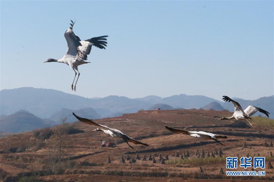 这是11月29日在位于贵州省威宁彝族回族苗族自治县的贵州草海国家级自然保护区内拍摄的黑颈鹤。 据贵州草海国家级自然保护区管理委员会统计,日前已有上千只黑颈鹤飞抵草海越冬。 新华社发(王纯亮 摄)