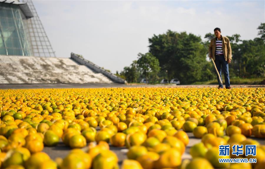 在江门市新会体育中心,一名工人在晾晒柑果果皮(11月29日摄)。 新华社记者 邓华摄