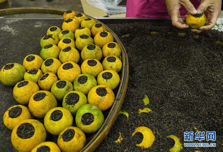 一名工人在对清洗风干后的鲜果壳进行填茶工序,用来制成柑普茶(11月29日摄)。 新华社记者 邓华摄