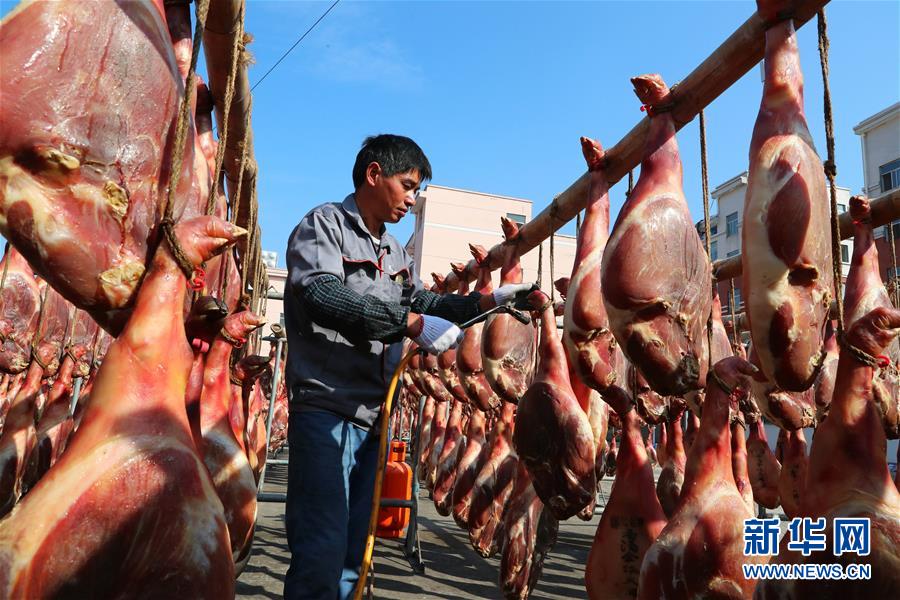 12月1日,浙江省金华市东阳市南马镇一家火腿公司的晒场上,工作人员整理晾晒的火腿。新华社发(包康轩 摄)
