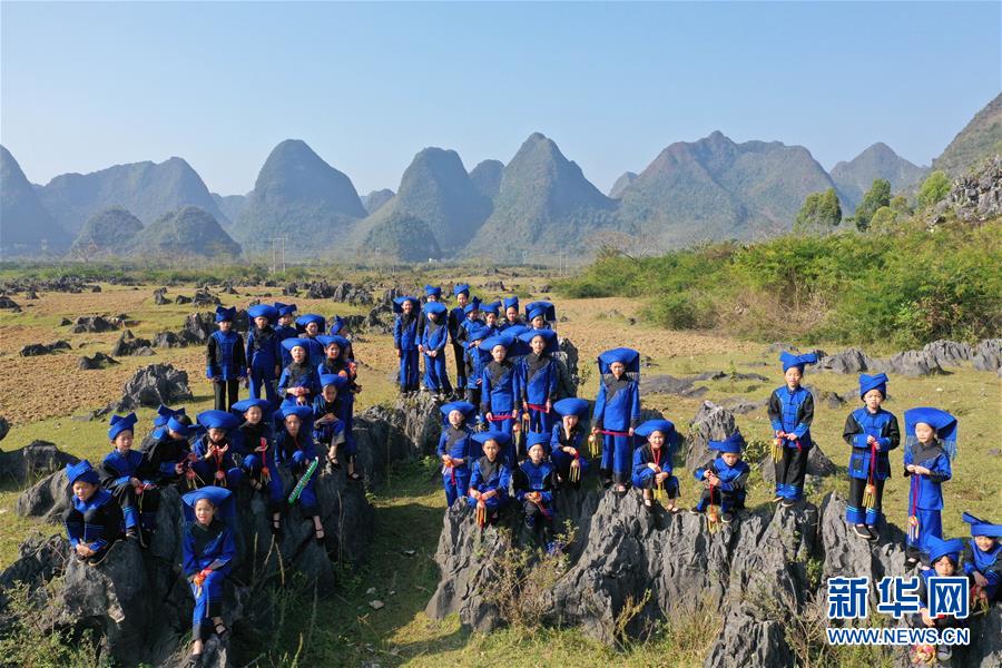 广西百色靖西市安德镇中心小学的孩子们在排练山歌(11月28日无人机拍摄)。 新华社记者 周华摄