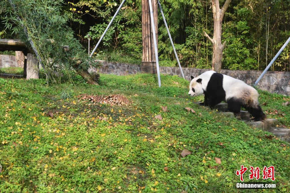 海归大熊猫“高高”在新家玩耍。 李传有 摄