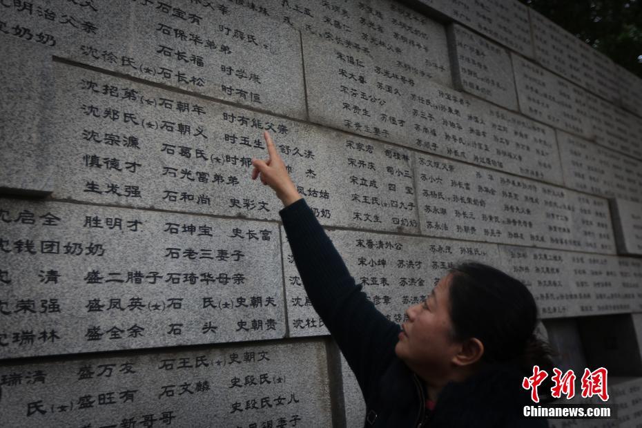 12月3日,南京大屠杀死难者遗属家祭活动正式启动,遗属们通过在侵华日军南京大屠杀遇难同胞纪念馆“哭墙”(遇难者名单墙)前献花、敬香、跪拜和诵读家信等形式,表达自己的哀思。图为南京大屠杀幸存者石秀英的家人在遇难者名单墙前。 中新社记者 泱波 摄