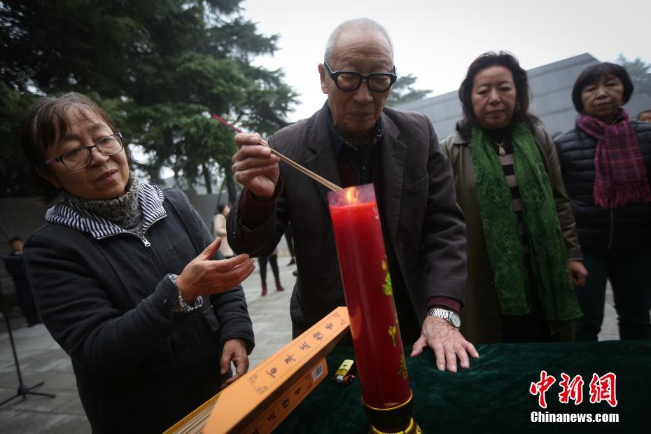 12月3日,南京大屠杀幸存者余昌祥(左二)和他的家人祭拜遇难亲人。当日,南京大屠杀死难者遗属家祭活动正式启动,遗属们通过在侵华日军南京大屠杀遇难同胞纪念馆“哭墙”(遇难者名单墙)前献花、敬香、跪拜和诵读家信等形式,表达自己的哀思。 中新社记者 泱波 摄